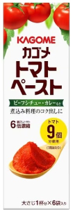 最初はトマトピューレを使いましたが、使い残しが次回までに賞味期限がきてしまい止めました。トマトペーストは、1箱が6袋に分かれていて